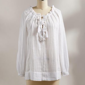 Embrace your artistic spirit in our sheer. easy-fit top with ladder lace. ruffle neckline and tassel ties. Cotton/viscose. Hand wash. Imported. Exclusive. Sizes XXS (00). XS (0 to 2). S (4 to 6). M (8 to 10). L (12 to 14). XL (16 to 18). Approx. 25L.
