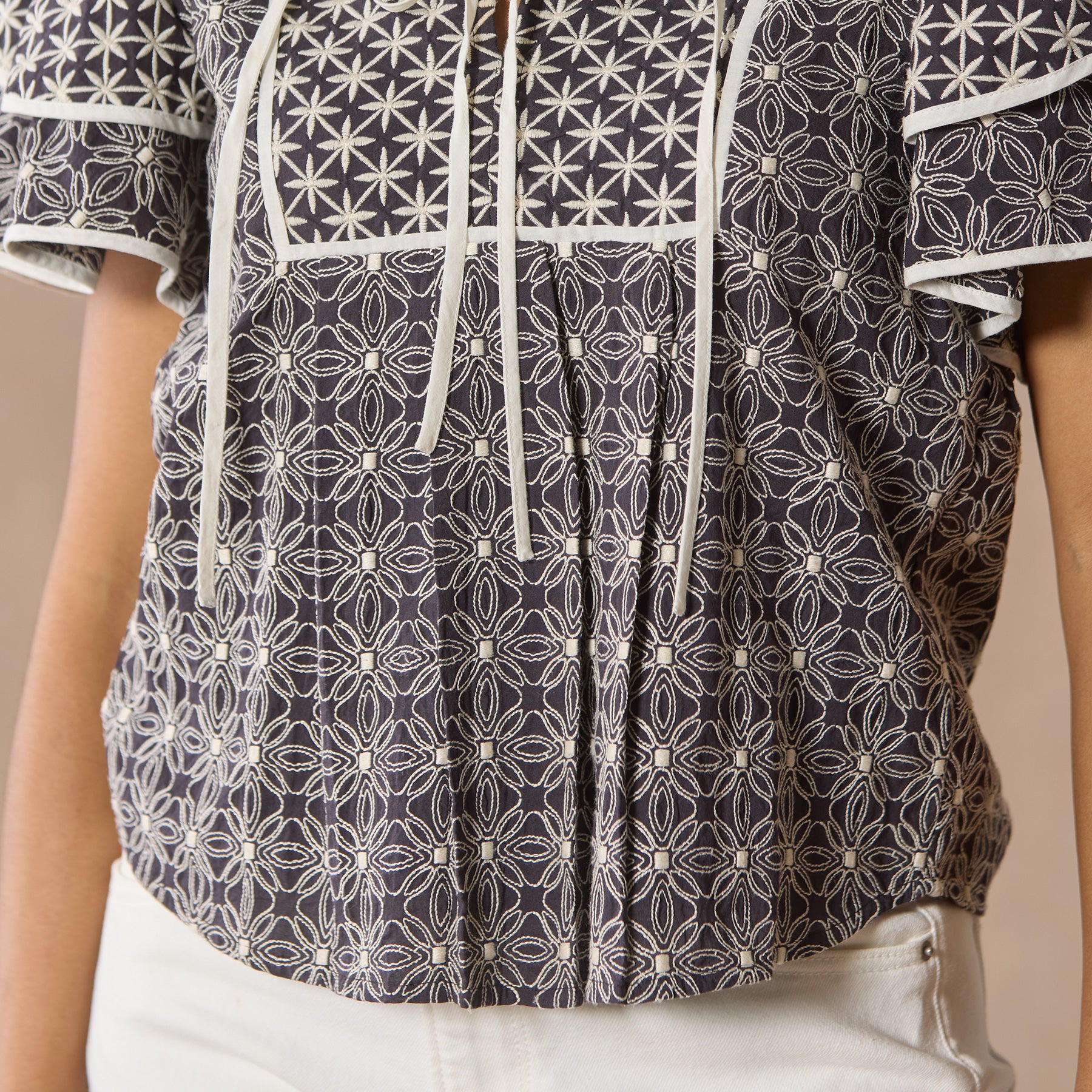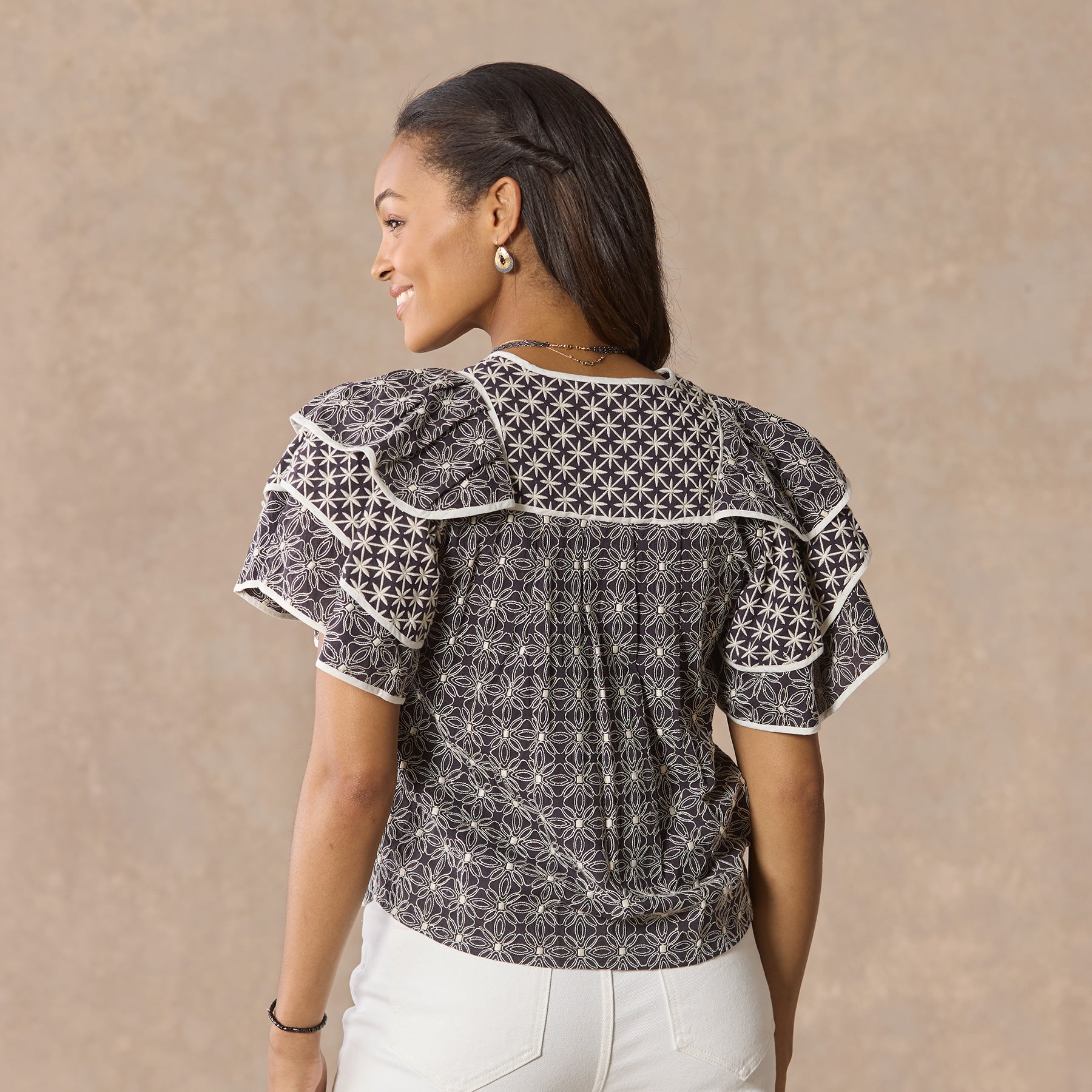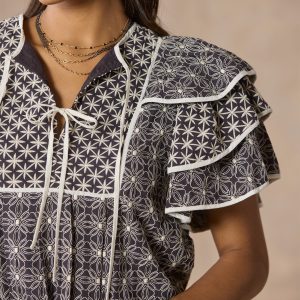 This flirty top features ruffled. tiered sleeves with contrasting piping. a notch collar. contrasting prints and embroidery. Cotton. Dry clean. Imported. Sizes XS (0–2). S (4–6). M (8–10). L (12–14). XL (16–18). Approx. 24.5l.