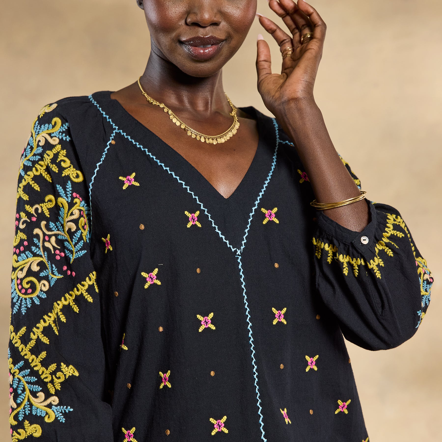 There’s joyful bohemian flair in this yarn-dyed top with luscious allover embroidery. blanket stitch details. three-quarter sleeves. shell buttons and V-neck. Full. easy fit. Cotton. Machine wash. Imported. Exclusive. Sizes XXS (00). XS (0 to 2). S (4 to 6). M (8 to 10). L (12 to 14). XL (16 to 18).Approx. 22-1/2L.