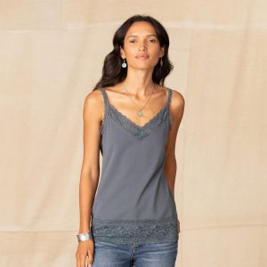 An everyday essential with the most beautiful lace at V-neck. shoulder straps and hem. Stretchy and soft. it makes the perfect underlayer. Supima cotton/spandex. Machine wash. Imported. Exclusive. Sizes XS (0-2). S (4-6). M (8-10). L (12-14). XL (16-18). XXL (20-22). Approx. 26l.