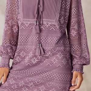 You’re a vision in our allover lace shift dress with chiffon pintuck detail. Flounce hem. tasseled neckline ties. smocked cuffs and full sleeves. Popover styling with separate slip. Nylon. Hand wash. Imported. Exclusive. Sizes XS (0-2). S (4-6). M (8-10). L (12-14). XL (16-18). XXL (20-22). Approx. 38.5l.