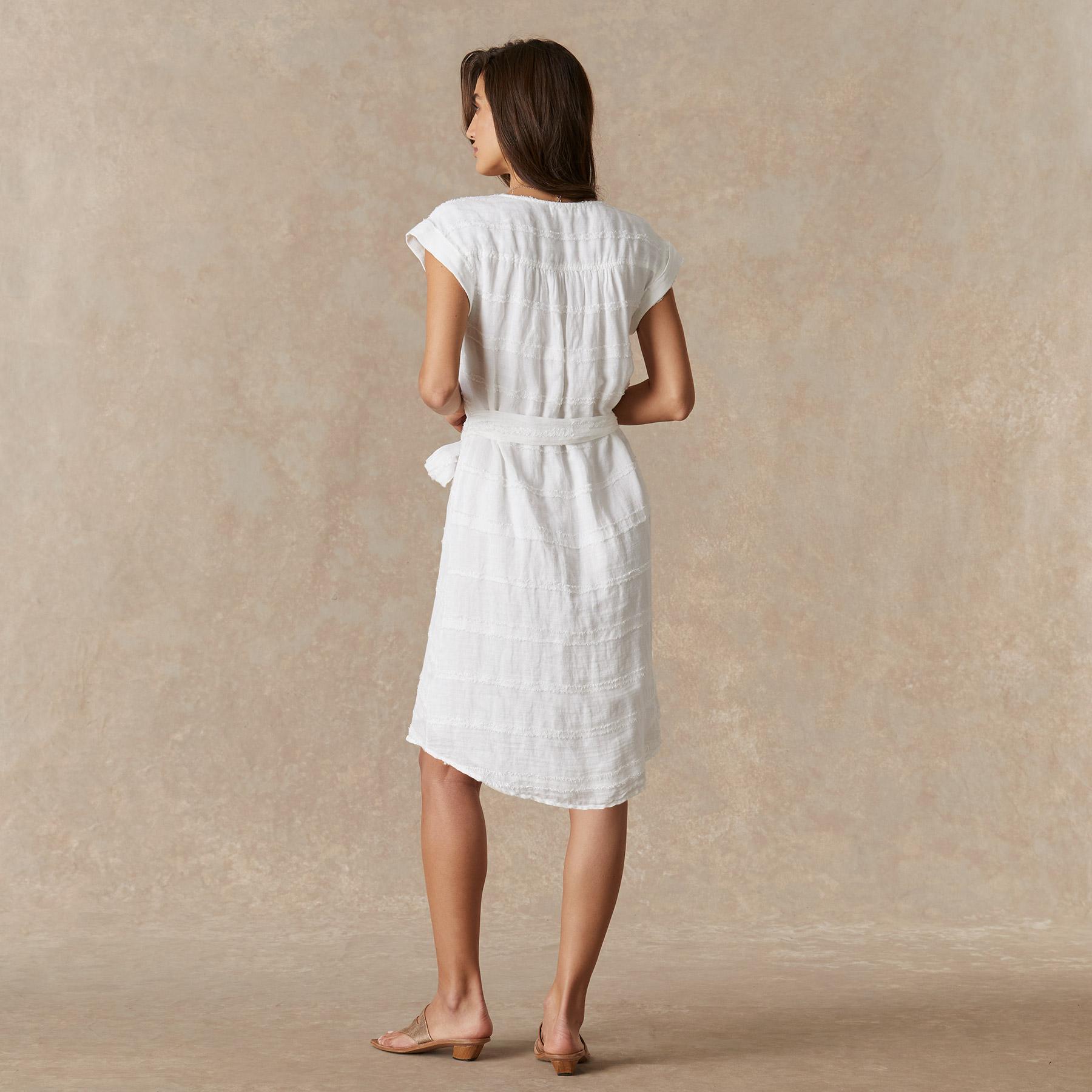 This flirty. wear-anywhere dress is handcrafted and features a button-down style. subtle stripe and self tie. Linen/rayon/cotton. Machine wash. Sizes XS (0-2). S (4-6). M (8-10). L (12-14). Approx. 37l.